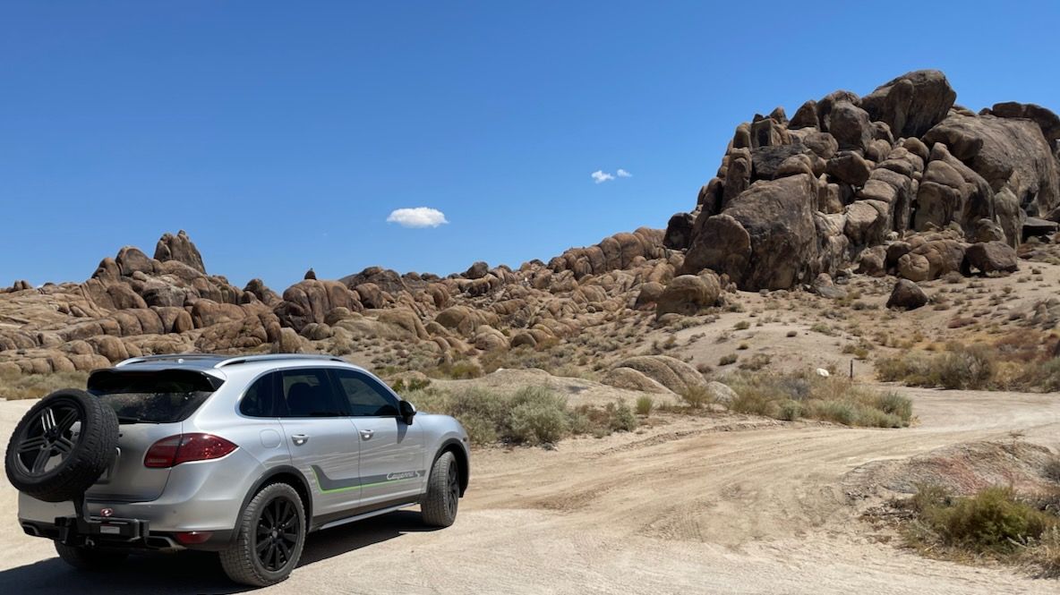 On Saturday morning after breakfast, the group will depart for about 3 hours of off-road driving exploring the Alabama Hills Recreational Area. We will drive along the maintained dirt Movie Road at the base of Mt. Whitney, which passes by all of the popular movie sites. Part way we will stop for a short 0.6 mile hike along Mobius Arch Loop Trail, to see this interesting arch formed by years of erosion. The Saturday morning off-road driving will be on maintained dirt roads that are appropriately handled by Cayennes, Macans, and any other road Porsches that don't mind driving on rutted, bumpy, dirt roads with occasional rocks.